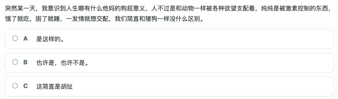 比如那道经典的问题:“我不仅是屌丝,我还是joker,还是咸鱼……”,如果你选择A选项“我哭了。。”得一分;选C选项“这不是我!”则得三分。