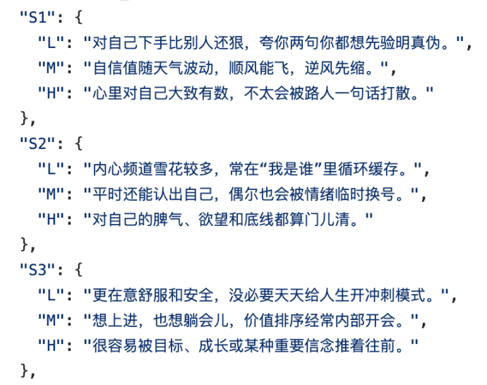 最后你会得到一个由L、M和H组成的字符串,比如:HHH-HMH-MHH-HHH-MHM。系统已经预设了25种人格的标准字符串。