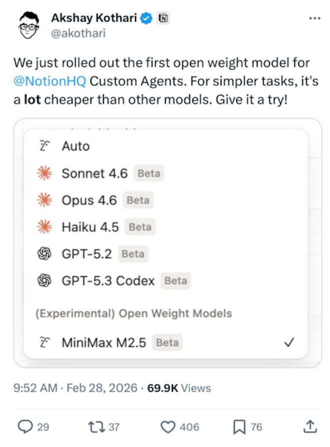 最新消息,Notion联合创始人Akshay Kothari宣布,Notion Custom Agents正式引入MiniMax M2.5作为模型选项,与Claude Sonnet 4.6、Opus 4.6、Haiku 4.5以及GPT-5.2、GPT-5.3 Codex等闭源模型并列。