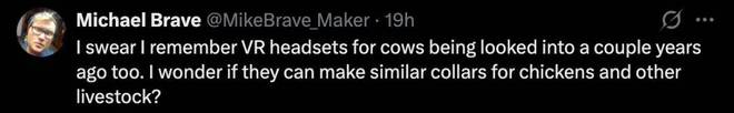还有人提到几年前也有研究者尝试为牛配备VR头显,不禁好奇是否也能为其他牲畜设计类似装置。