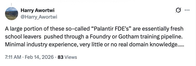 但在社交媒体X上,一名用户犀利地指出,很多所谓的Palantir FDE其实只是刚毕业的学生,被推进了培训流水线,他们几乎没有行业经验,甚至缺乏领域知识。