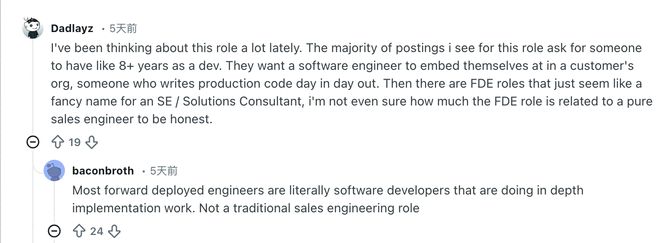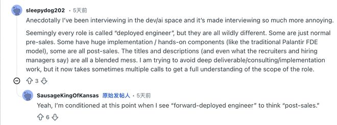 一位资深工程师在Reddit上吐槽,现在的面试简直像谜一样,每个职位都叫部署工程师,但具体内容却千差万别。有的是售前,有的则是包含大量实施和动手操作的售后(类似于传统的Palantir FDE模式)。为了避开那些深度交付咨询的活儿,他不得不多次打电话询问才能搞清楚岗位职能,这些头衔简直让人一头雾水。
