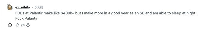 但在社交媒体和职场论坛上,这种不体面的工作正被极高的薪酬所对冲。Reddit上一位网友(@ex_nihilo)爆料称Palantir的FDE年薪高达40万美元以上。正如科技人才招聘公司Betts Recruiting的总裁兼首席运营官帕特里克·凯伦伯格指出的,科技公司为FDE职位开出天价薪水,这可能会吸引更多的工程师考虑投身一线。