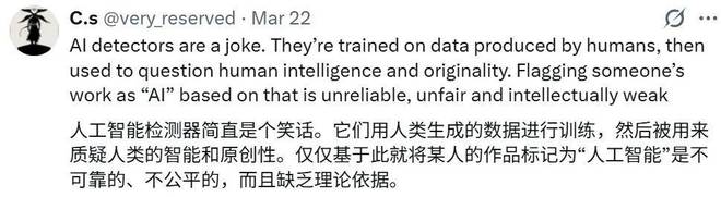 有评论者认为,“这些AI检测工具简直就是笑话。它们是基于人类创作的数据训练出来的,却反过来质疑人类的智慧和原创性。仅凭这一点就判定某人的作品是AI生成的,既不合理也不公平,更不具备逻辑性。”