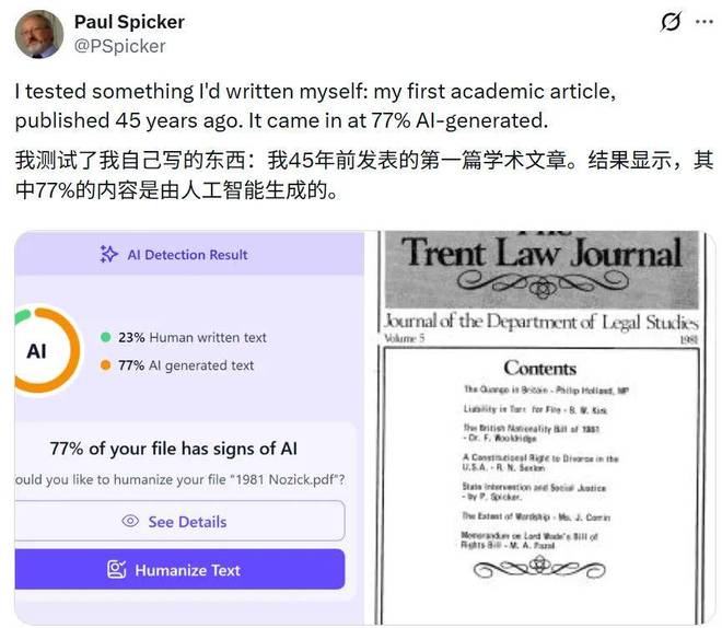 苏格兰阿伯丁罗伯特戈登大学的公共政策荣誉退休教授保罗·斯皮克的一篇论文也被判定有77%的内容是由AI创作的。