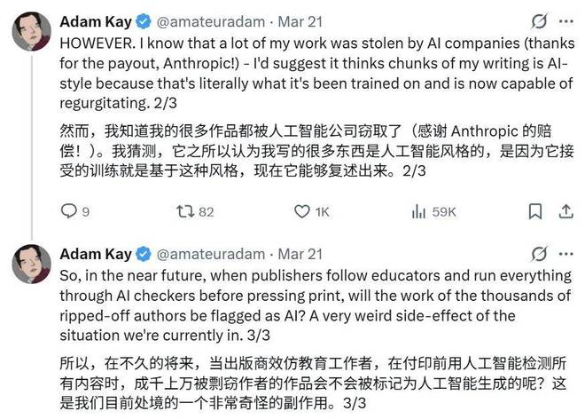 作家亚当·凯提出了一种可能的解释:人类创作的大量内容被用于训练AI模型,因此当AI模型判断某些段落像是AI风格时,实际上是AI再现了它曾经学习过的人类表达。
