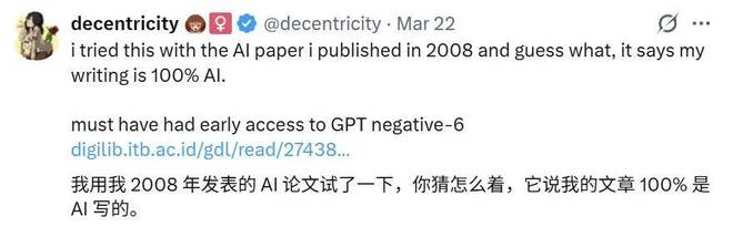 众多网友也分享了他们的检测结果。一位网友用自己2008年发表的一篇关于AI的论文进行了检测,结果显示这篇论文完全是由AI生成的,这位网友戏称自己使用的是“GPT负6”版本。