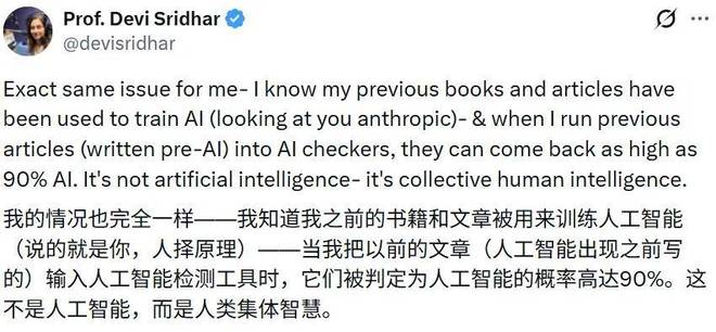 一名网友指出,“这些所谓的AI检测工具本质上是荒谬的,它们首先使用人类的知识来训练AI,然后再用这些AI来判断一段内容是否由AI生成,而这个判断本身建立在最初训练所依赖的人类智能之上。从逻辑上讲,这确实是一种荒诞的循环。”