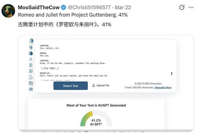连莎士比亚的经典作品《罗密欧与朱丽叶》也被认为有41%的内容是由AI生成的。