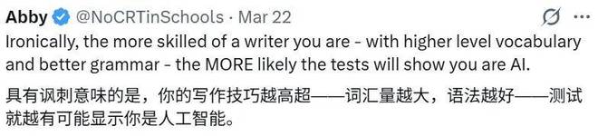 更令人困惑的是,写作水平越高的作品(如词汇丰富、语法规范),反而越容易被AI检测工具误判为AI生成的。
