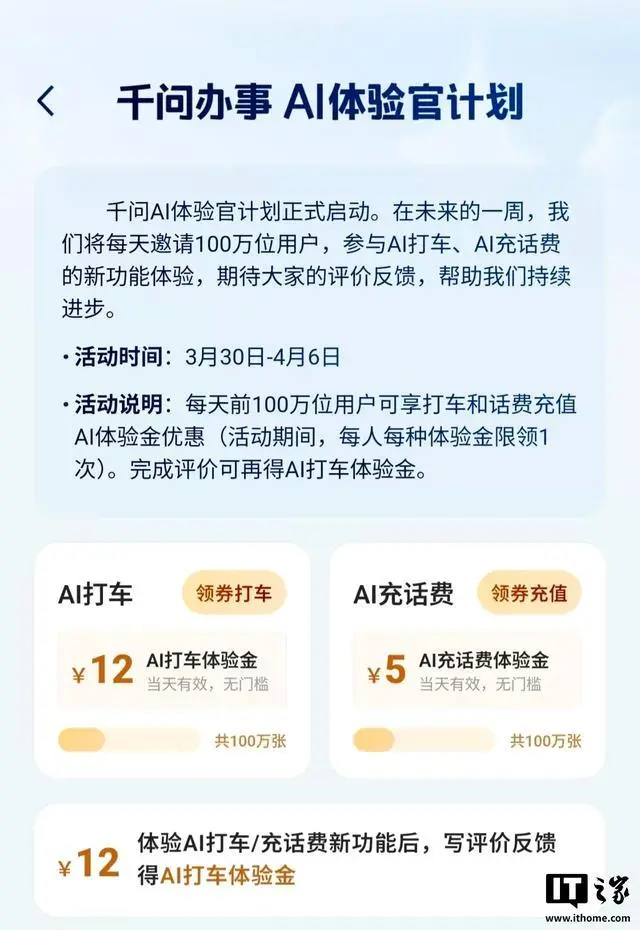 IT之家实测,打开千问 App,点击左上角“千问办事”,即可领取 12 元 AI 打车体验金以及 5 元 AI 充话费体验金。用户说出充值要求,如“帮我手机充 50”即可立减 5 元。