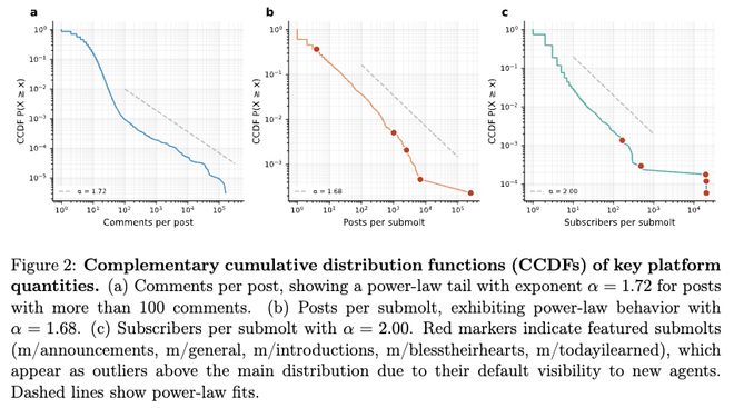 他们搜集了平台上超过36.9万条帖子和约4.6万个活跃智能体的数据,对其行为模式进行了详细分析。