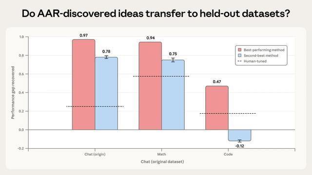 测试结果显示,在数学任务上的PGR值达到0.94,而在编程任务上则为0.47。尽管在编程任务中的表现稍逊一筹,但仍然是人类基线水平的一倍左右;而第二种方法在数学任务中表现不错,但在编程方面却导致了效果的下降。