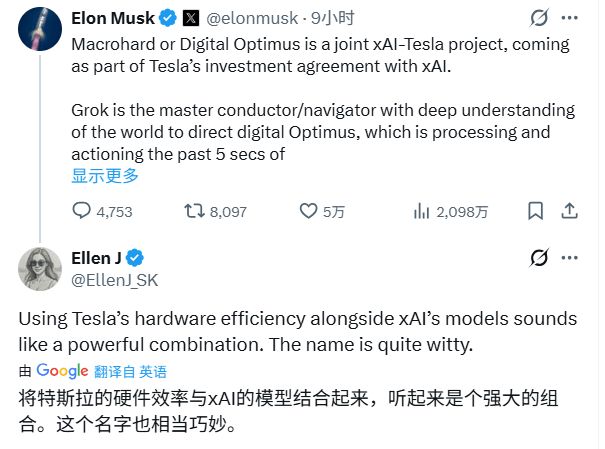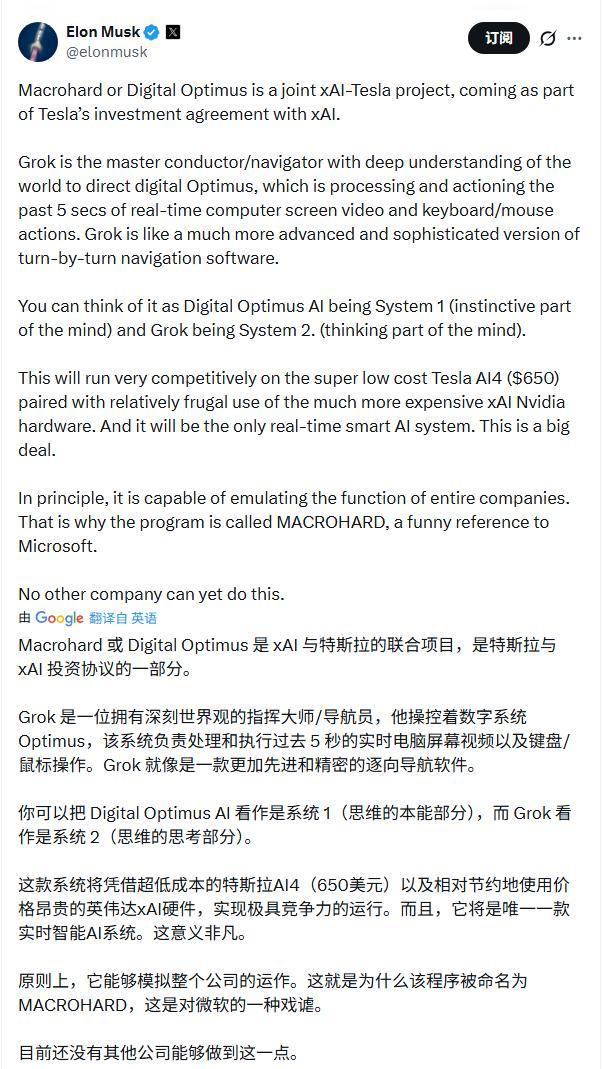 3月12日凌晨,他发布了一条帖子详细说明“巨硬”与数字擎天柱的关系。他说,这两个项目其实是xAI和特斯拉合作的结果,并且是特斯拉投资xAI协议的一部分内容。