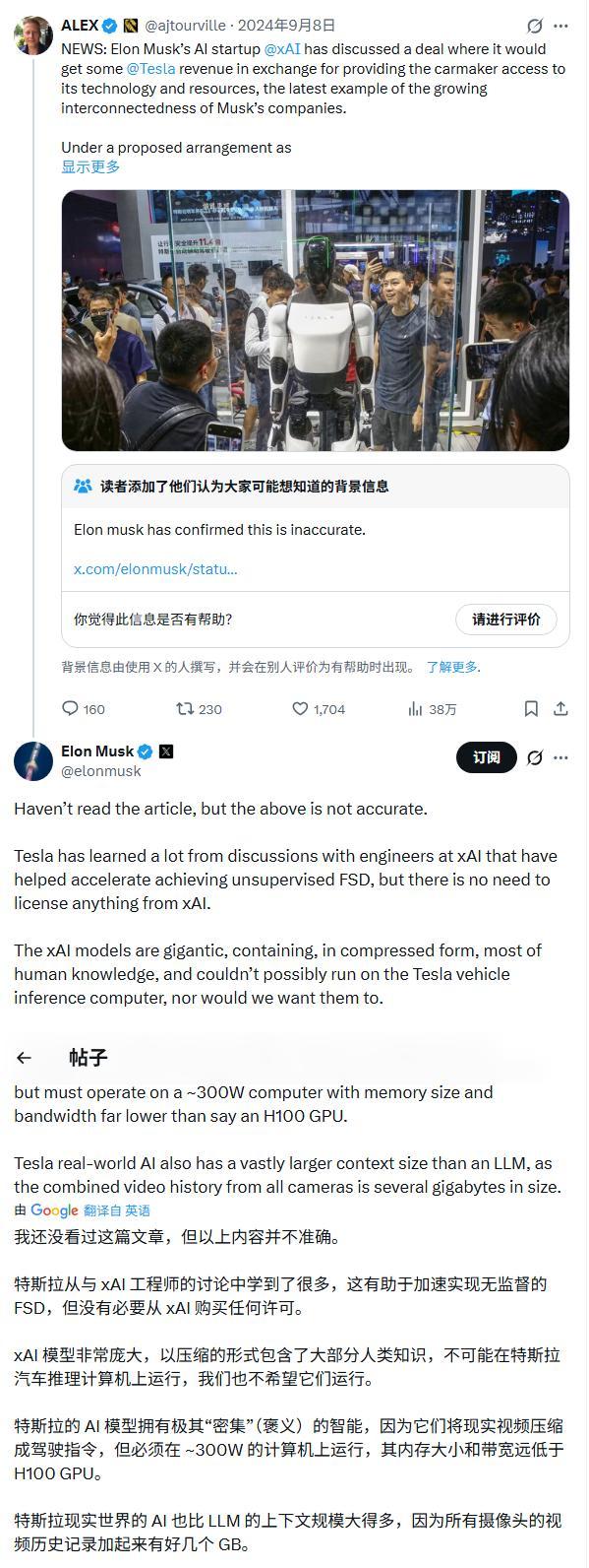 2024年9月,针对《华尔街日报》关于特斯拉正讨论与xAI分享收入以换取使用其AI模型的报道,马斯克曾在X上回应称特斯拉无需从xAI获得任何技术授权。他还解释说特斯拉的现实世界AI系统比任何大语言模型都大得多,而xAI的模型过大,无法在特斯拉的车辆推理计算机上运行。