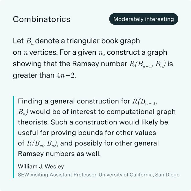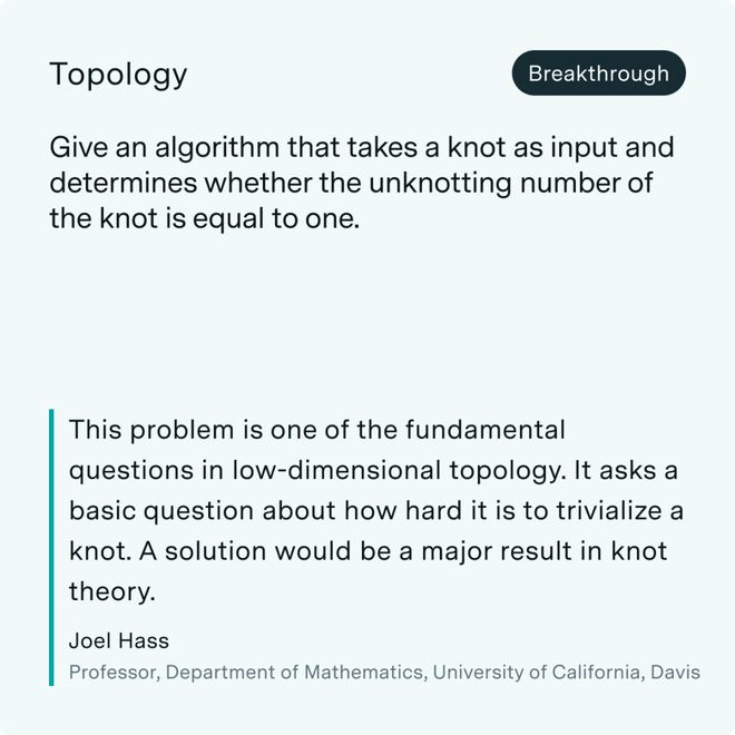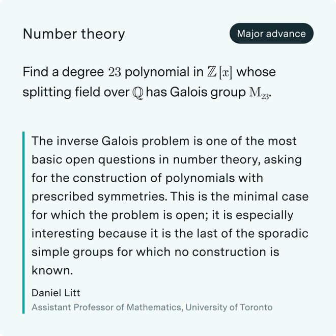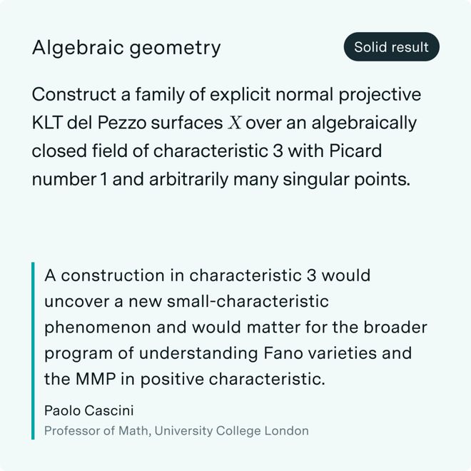 Epoch AI 在同期推出 FrontierMath: Open Problems,汇集了 16 个未解的数学难题。虽然没有标准答案,但他们为每道题创建了自动评分系统以评估 AI 的解答是否正确。