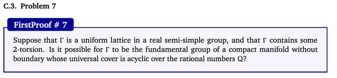 问题背景:代数拓扑/微分几何。判断包含二阶扭转元素的半单李群均匀格,能否作为某个万有覆盖在有理同调下无圈的紧致无边界流形的基本群。