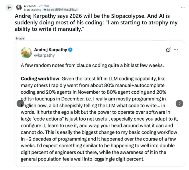 作为前OpenAI联合创始人和特斯拉AI部门总监,Karpathy自去年12月以来再也没有亲自编写过任何代码。