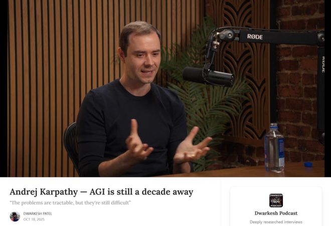 在2025年10月的一次播客访谈中,Karpathy的态度截然不同。