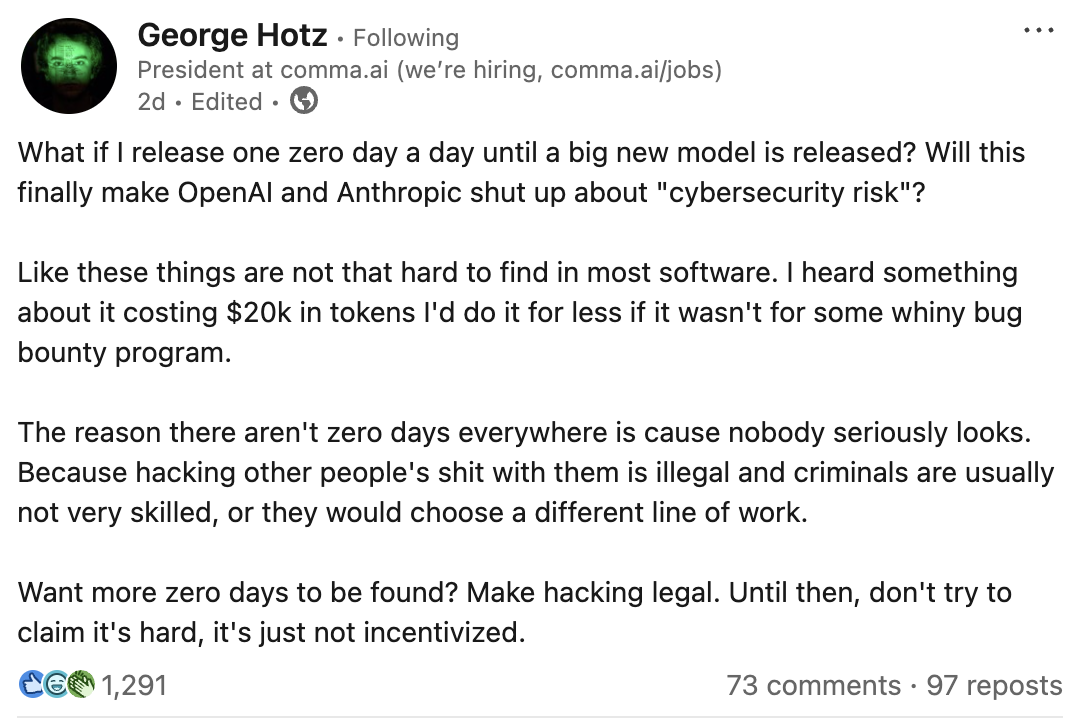 同时顶级网络安全专家、传奇黑客George Hotz也公开质疑这些风险被严重夸大了。