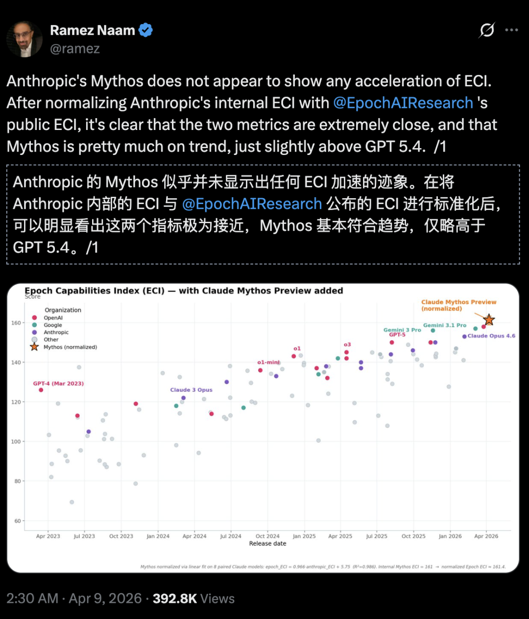 在Epoch能力指数(ECI)上,Mythos并没有显示出加速的趋势,仅比GPT 5.4强一点。
