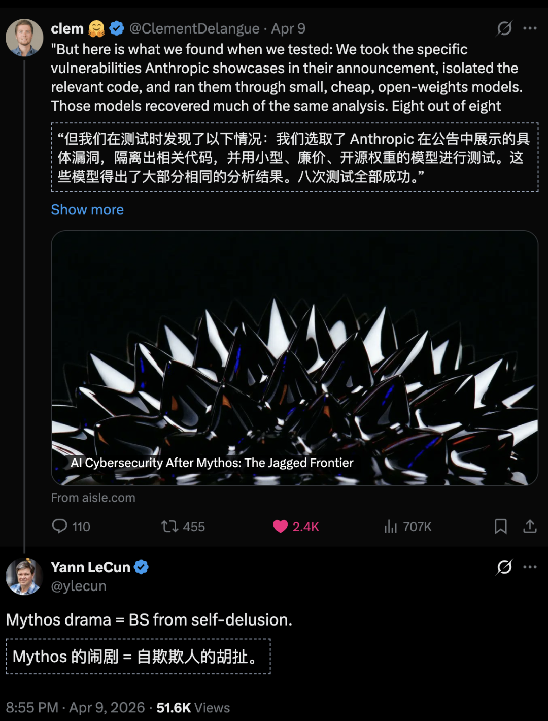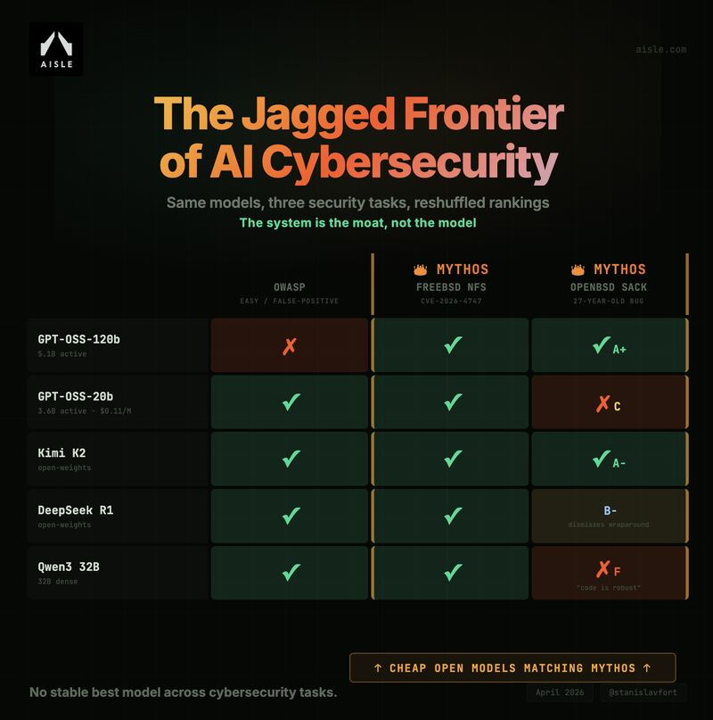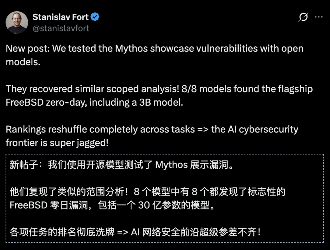 AISLE实验的研究员对Mythos的成果进行了重新测试,发现: