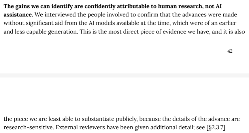 同时,Anthropic在Mythos上的进展主要依靠人类研究,并未得到AI模型显著的帮助。目前尚未出现明显的递归式自我改进现象。