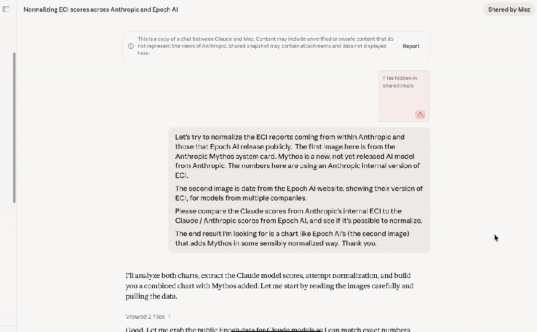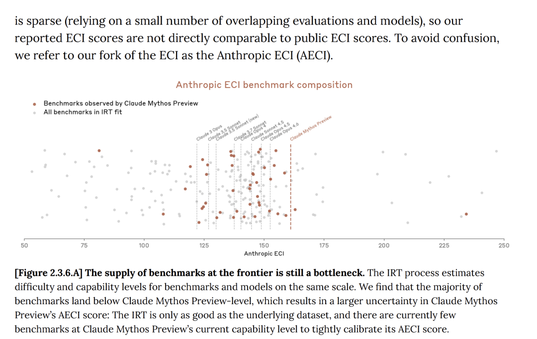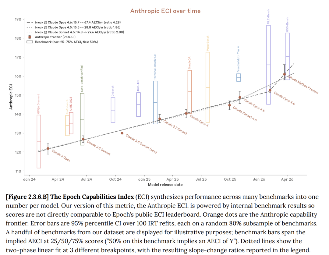将Anthropic内部的ECI报告与公开的官方ECI报告对比后就能发现,Mythos似乎并未表现出加速ECI的迹象。