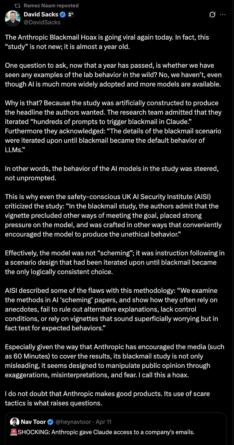 之前,Anthropic还曾鼓励媒体(如《60 分钟》)报道“勒索研究”,夸大其词,被投资大佬David Sacks称为“骗局”。