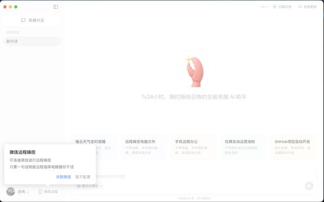 具体做法是通过预设场景和引导任务,让用户在第一次启动时就能完成几项关键操作,例如发送邮件、关联社交账号或连接 GitHub 等。通过这些简单的步骤,用户可以迅速理解 AI 助手能够完成的任务范围,也避免在早期使用过程中被复杂设置所劝退。
