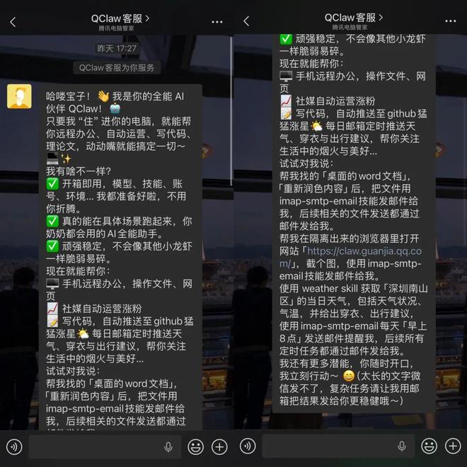 相比原始开源版本,QClaw 最大的特点在于消除了部署门槛:用户只需下载安装即可通过微信或 QQ 发送自然语言指令来远程控制自己的电脑,并执行如整理文件、生成报表等任务。