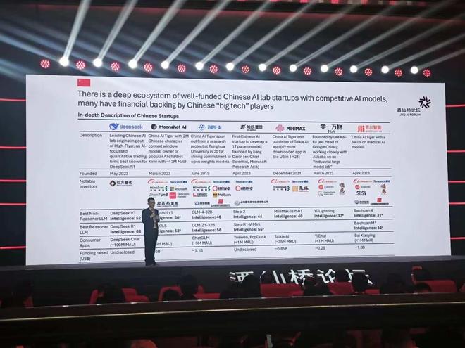 李海洲则分析了中国国内AI行业的现状。他认为中美两国在前沿大模型性能上的差距已经缩小到了历史最低点,并且中国的开源模型在全球范围内处于领先地位,形成了由科技巨头和创新企业共同驱动的完整产业链条。