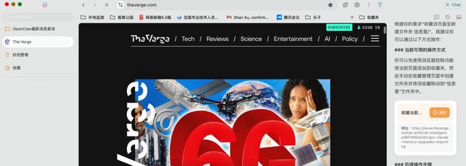 比如说收藏网页,在给出收藏网页指令后,AI 首先会阅读官方的指令执行手册,然后拆解任务步骤执行,最后,Tabbit 会给出一个执行代码框。用户点击之后,浏览器就会自动化执行,最后收藏该页面。据说,保存标签组到收藏夹,几周后重访,AI 上下文完整如初。