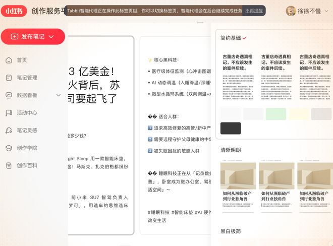 随后,我们强调内容已经上传后,浏览器自动跳至小红书页面登录,然后让用户扫码登录。完成扫码登录之后,它又开始继续执行相关指令,我们可以看到 Tabbit 智能代理是如何一步步操作的,如何调用浏览器鼠标点击什么页面,随着进入发布笔记页面后,AI 自动将标题、内容填入其中然后开始排版,并且设计多种风格。每一个指令的运转都清晰可见,用户可随时停止运转。最后,整个内容顺利一键发布成功,全程除了登录扫码,没有任何人为干预。