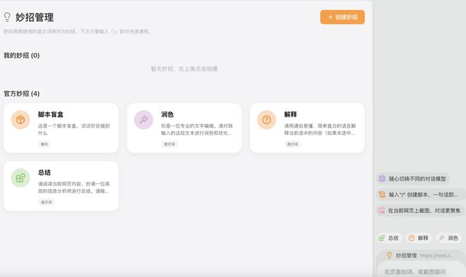 其次,当你在对话框提问的时候,还可以打开妙招管理功能中预制的 Skills 库,用户可以随时提问、解释和总结。
