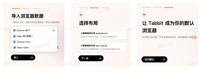 这可能是我使用诸多应用当中迁移最方便的一次。下载完安装包,什么都没有注册时,Tabbit 自动识别了我电脑上常用浏览器应用,甚至打开选项菜单,只等我确认。它甚至可以识别出同一个浏览器内的多个账户,询问用户具体要导入哪个账户的哪些信息。