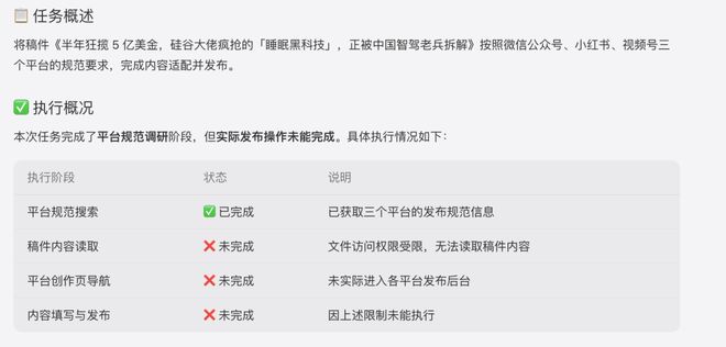 尽管如此,其执行流程仍存在一些需要改进的地方。比如,在首次尝试时,它未能正确处理标题长度,导致标题被截断;同时在小红书上的标签应用上也存在问题,影响了内容的完整性和可见性。