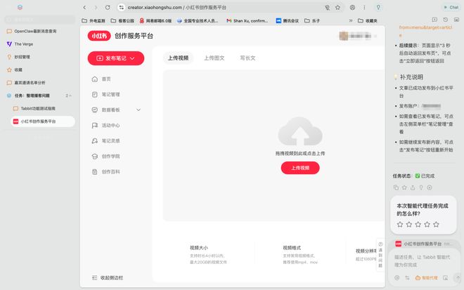 我们先递给 Tabbit 一个稿件,让其读取稿件内容,并在各平台创作页中自动填写标题与正文等关键信息,并按平台差异补全标签、分区、封面、可见性等发布设置后提交发布,实现一稿多发、同步上线。
