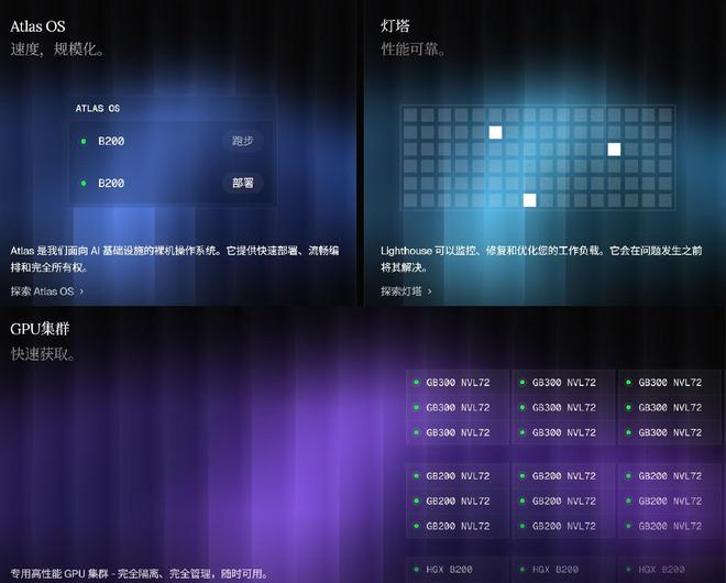如今,该公司管理超10万块GPU,可在数天内交付数千张GPU集群,并提供Atlas OS(裸金属操作系统,用于资源编排与监控)、Lighthouse以及全托管GPU集群服务,强调零设置、高SLA(15分钟工程响应)和AI优化配置。