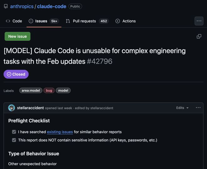 从今年二月开始,许多Claude用户明显感觉到产品变了味道,抱怨不断增多:虽然没有系统故障,但是输出内容变得更浅薄、更急于给出修改结果,简单的任务也屡次失败。