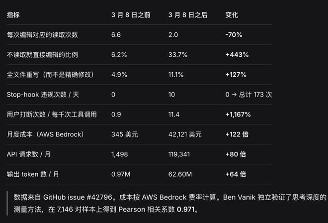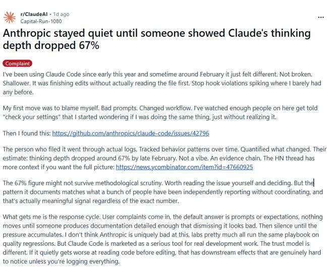 - 二月底思考深度下降了67%,随后Anthropic开始隐藏推理过程。