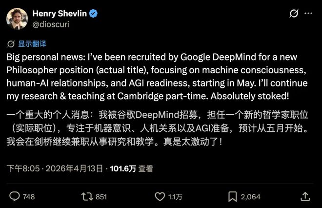 就在Clark发言的同一周,Google DeepMind宣布招了一位头衔就叫「Philosopher」的人:Henry Shevlin。
