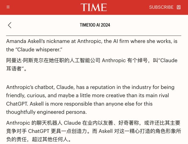 2024年,TIME杂志把她评为AI领域最具影响力的100人之一,提到她在Anthropic被称作「Claude耳语者」,是模型「人格特质」的缔造者: