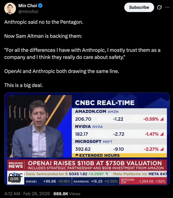 奥特曼今天早上在 CNBC 节目中说道:「我个人认为五角大楼不应该以《国防生产法》威胁这些公司。尽管我和 Anthropic 公司有很多分歧,但我总体上还是信任他们这家公司,而且我认为他们确实很重视安全。」