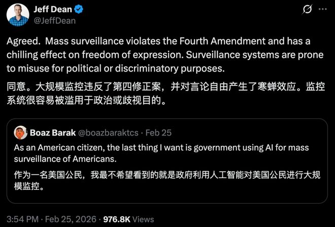 谷歌首席科学家 Jeff Dean 也以个人身份在 X 上表达了对政府大规模监控的反对意见。