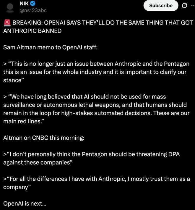 今天凌晨,也有媒体报道称,五角大楼已同意 OpenAI 制定的「在机密环境中安全部署其技术的规则」,但尚未签署合同。Anthropic 的大单也可能是由 OpenAI 来接。