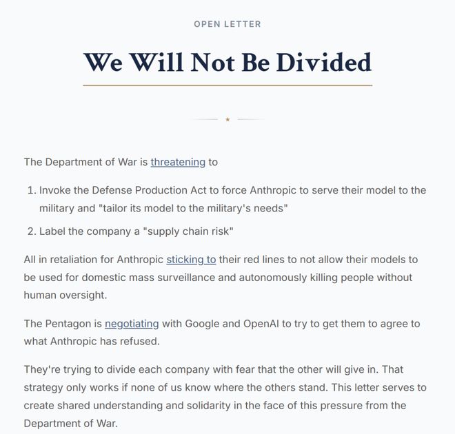 在奥特曼公开发声之前,OpenAI 和谷歌内部就涌动着对 Anthropic 的强烈同情与支持。在 2 月 26 日,数百名来自 OpenAI 和谷歌的员工联合签署了一封名为《我们不会被分裂》(We Will Not Be Divided)的公开信,声援 Anthropic 的立场。