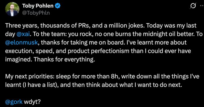 此外,xAI 的另一位联合创始人 Toby Pohlen 刚刚宣布离职,这是本月第三位离职的联合创始人。xAI 的 12 位联合创始人中,已有 6 位离开。