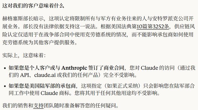 不过很快,Anthropic 发布了声明,重申了自身的坚持之外,表示其客户的业务不受影响。