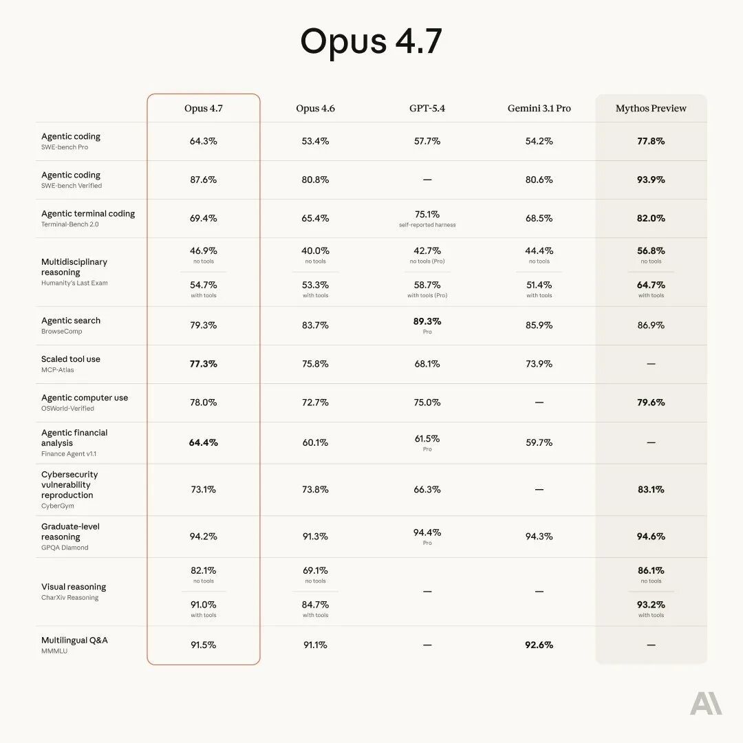 对比更高级别的SWE-bench Pro测试,Opus 4.7的成绩也有所提高,从53.4%升至64.3%,而GPT-5.4和Gemini 7.2则分别为57.7%和54.2%。然而Mythos Preview的得分却达到了惊人的77.8%。